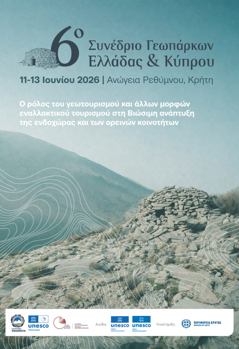 Με μεγάλη μας χαρά σας προσκαλούμε στο Παγκόσμιο Γεωπάρκο UNESCO Ψηλορείτη όπου, μεταξύ 11-13 Ιουνίου 2026, θα φιλοξενηθεί το 6ο Συνέδριο Γεωπάρκων Ελλάδας & Κύπρου, με θέμα «Ο ρόλος του γεωτουρισμού και άλλων μορφών εναλλακτικού τουρισμού στη Βιώσιμη ανάπτυξη της ενδοχώρας και των ορεινών κοινοτήτων».